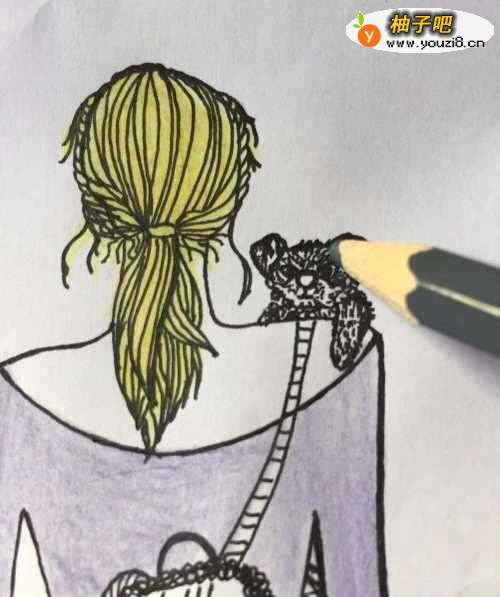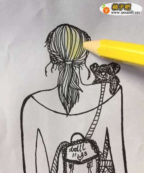 2明黄色彩铅给女孩子的发丝上色,黄色彩铅覆盖加深发丝的颜色。薰衣草色彩铅给女孩子的装扮上色。