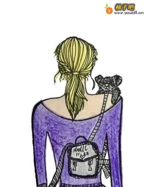4肤色彩铅给女孩子的皮肤上色,灰色彩铅给双肩包上色。紫色彩铅覆盖薰衣草色彩铅,加深装扮的颜色。