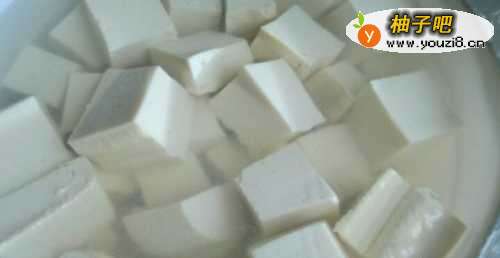 2把豆腐切小块也用淡盐水浸泡5分钟。