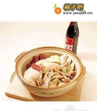 3将整只老鸭放入专用汤煲中,放入火腿片、笋干丝、大葱白、厚姜片,调入黄酒。