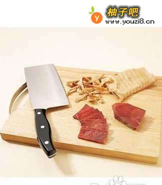 2金华火腿切成薄片(要逆着肉纹切,才不会散)。笋干事先用清水浸泡10小时以上,待软化后,再用手撕成细而均匀的丝。