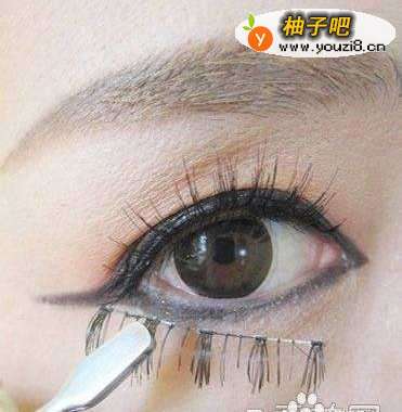 8利用纤长型假睫毛进行粘贴,上假睫毛从眼头开始小心调整位置,下假睫毛从眼尾开始调整位置,这样上下睫毛就可以很自然的衔接在一起。