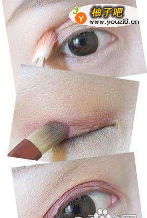 6用中号横刷在眼窝处轻刷一层橘色眼影,再沿着双眼皮褶皱处涂抹粉色眼影,最后在下眼睑的尾部刷上深蓝色眼影。