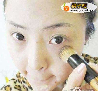 在全脸点涂粉底,用粉底液刷将粉底均匀涂抹开。粉底液刷的好处在于均匀粉质,且吸取多余的粉底让妆容更加自然。