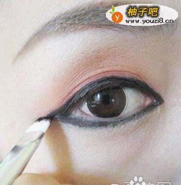 7配置宽的横刷蘸取眼线膏从眼头描画眼线,画的适合一定要沿着睫毛根部画,画至眼尾处要拉长0.5mm的距离,这样有让眼型延伸的效果。