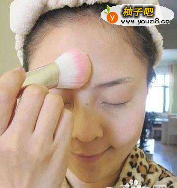 3在全脸轻扫一层米色散粉,刷的时候先T区再两边,鼻头两侧的鼻沟里不可以忽视。