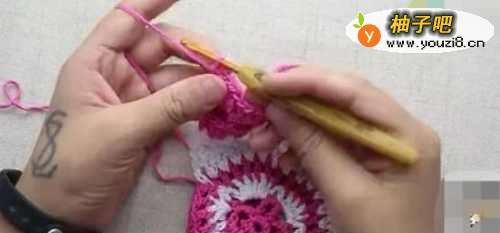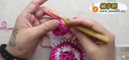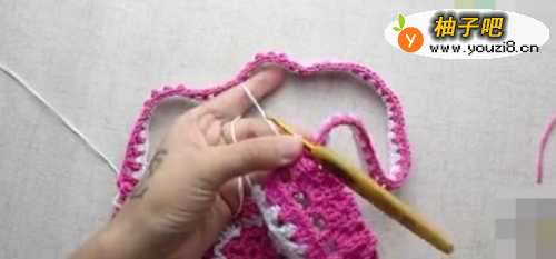 4钩包带:背带起头钩12针小辫子,然后转过头在第二个孔里钩短针,共钩6针短针,再钩一针小辫子针,在转过头回购。