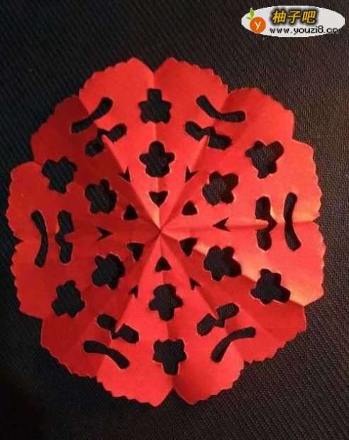 剪完之后,直接将窗花展开即可。 接着按照惯例,附赠一张其他剪纸图案,小火柴亲手剪裁的哟。大家按照小火柴教的办法继续设计新的图案,就会出现新的窗花呦。