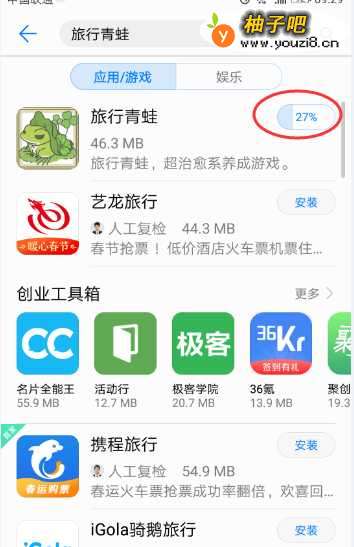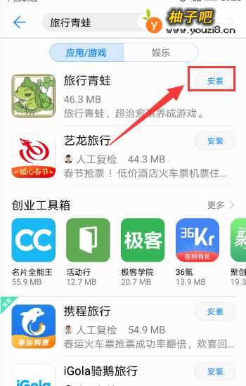 3在搜索结果中找到“旅行青蛙”中找到这款游戏,点击“安装”。