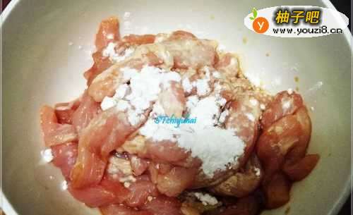 3取一个干净的小碗,将切好的瘦肉丝放入碗中,加入适量的盐巴、酱油、料酒、醋、生粉,用手揉搓均匀,放在边上腌制一会。