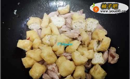 6瘦肉基本变白之后倒入豆泡块,准备少许热开水,先翻炒一会,然后加入盐巴、酱油、料酒,大火快炒,如果出现锅过热,能放入少许热水,炒一阵后试试豆泡的味道,合适后就以关火了,不需要炒太久,一盘豆泡炒瘦肉丝就做好了。