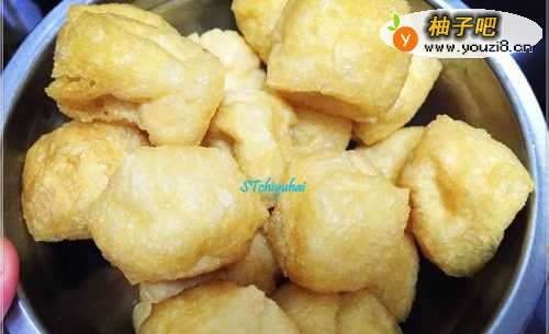 首先将购买的豆泡放入清水中过一遍,不宜浸泡太久,捞出沥干,然后将其对半切开,如果体积较大的能切成四份。也能家里自己制作豆泡,不过时间要久一些。