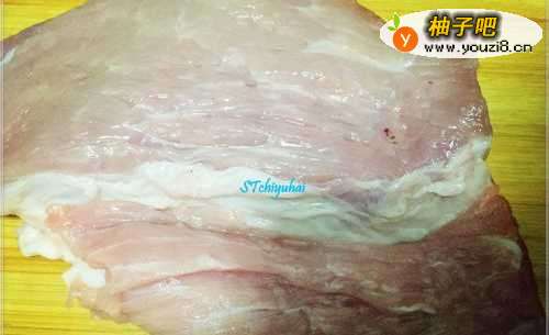2准备一片瘦肉,将瘦肉洗净,然后放到砧板上,沿着竖直纹理方向将其切成等长方块,然后再细切成丝条状。