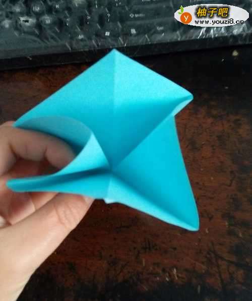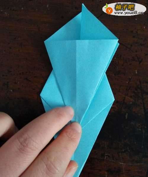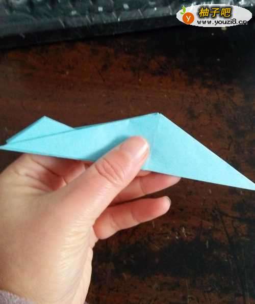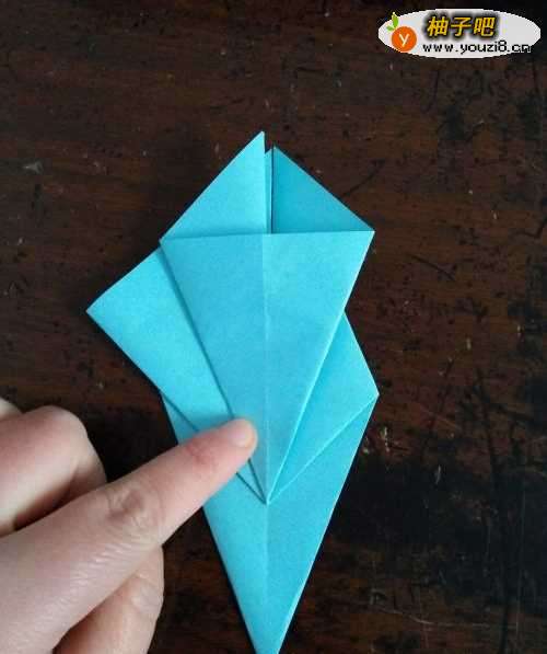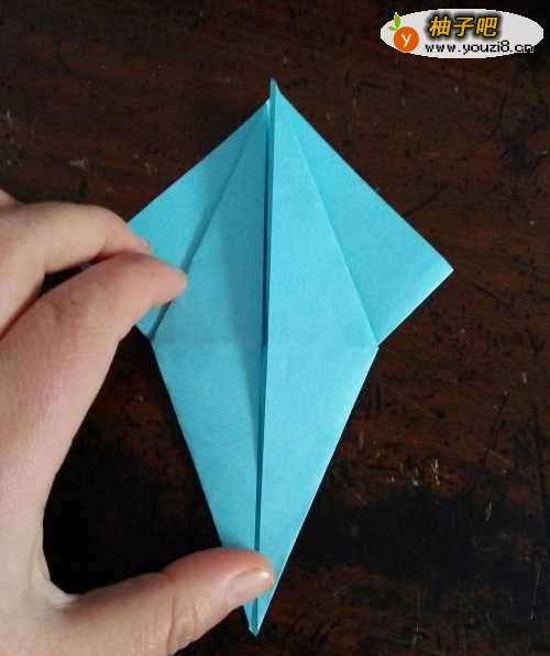 9对折后,我们把彩纸倒过来,把右侧的角向上对折,然后启用按照中间的折痕折回来。
