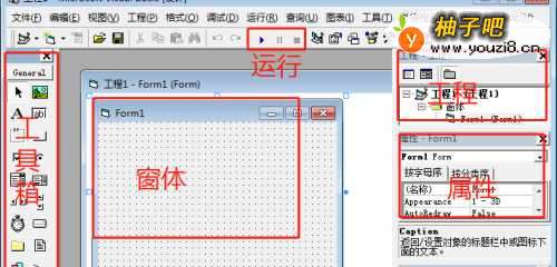 4启用软件之后选择新建的文件类型,就能看到VB6的工作界面。常用的就下图红色方框区域。
