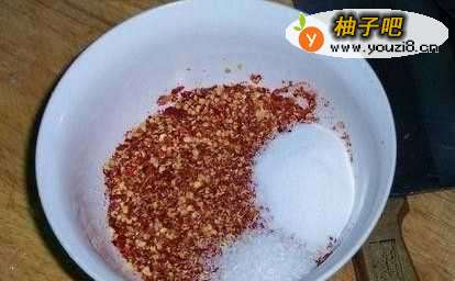 4辣椒面,盐,味精 ,加入适量凉白开,把辣椒面,盐,味精调匀 。