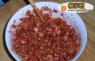 5把姜蒜苹果梨末儿倒入辣椒面中,搅拌 。