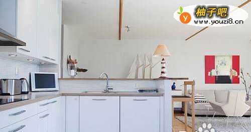 4厨房是通过一个小吧台与客厅隔开,厨房用具被很好的隐藏起来,节省空间。
