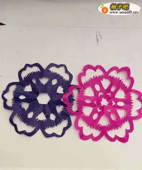 6第六步 画完图形之后 就拿起手工剪刀开始剪掉多余的彩纸 然后取开 一朵六角的火焰窗花就剪好了