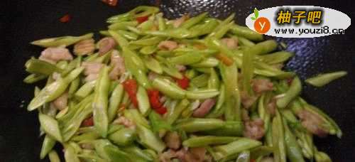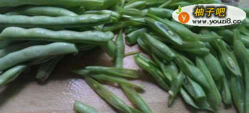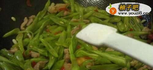 4把切好四季豆放入锅内翻炒。加入适量的开水,焖煮3分钟至熟。如图: