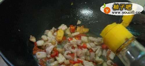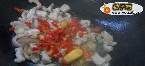 2五花肉切丝,热锅,下油,炒香五花肉。