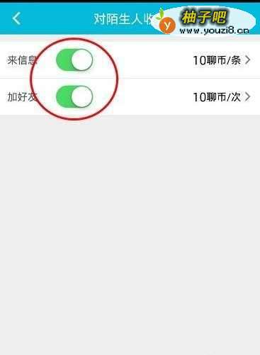5进入到对陌生人收费的使用界面中我们能看到默认的情况下来信息和加好友默认的情况下都是10聊币