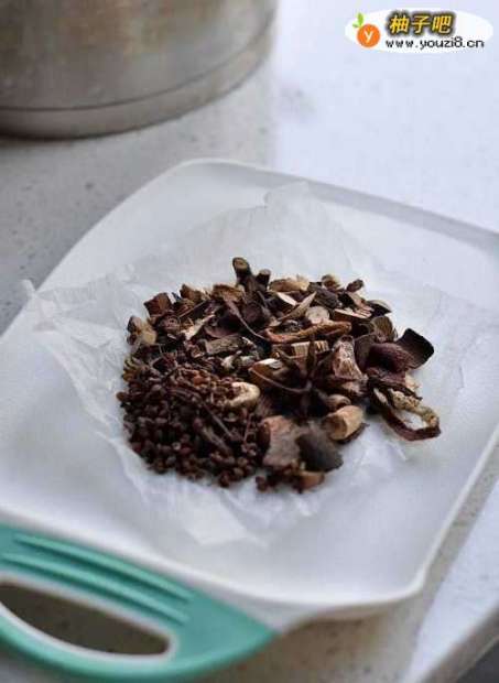 制作料包:把陈皮、莨姜、小茴香、麻椒、干菊花、八角、桂皮、香叶、草果、桔梗放进纱布里
