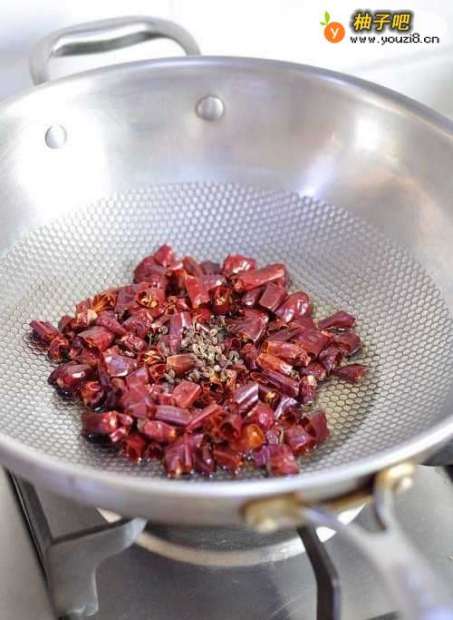 4把干辣椒切段,锅里倒适量油,油热后把干辣椒、花椒倒进去爆香