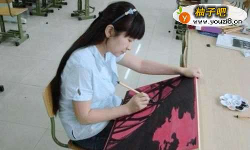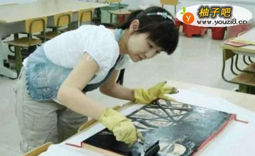 ①把以松节油调好的油墨,用勺子盛少许置于平底盛器上(如三合板),再以油滚来回滚动使油墨均匀地粘于油滚上,以便在版上均匀滚墨。