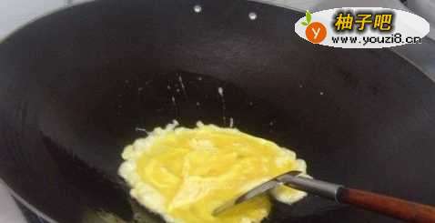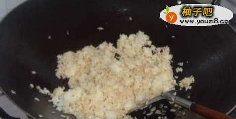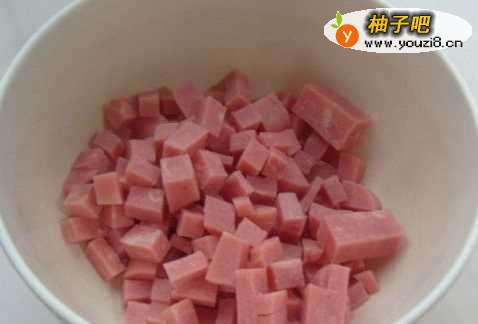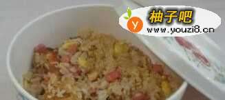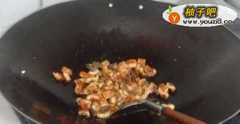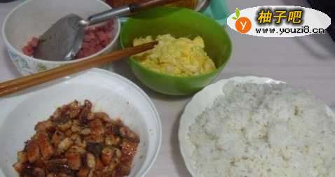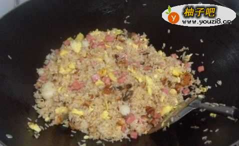 9然后放入火腿,鸡蛋,鳗鱼,炒几下,放入盐,炒匀出锅