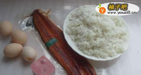将鸡蛋,鳗鱼片,火腿,米饭准备好