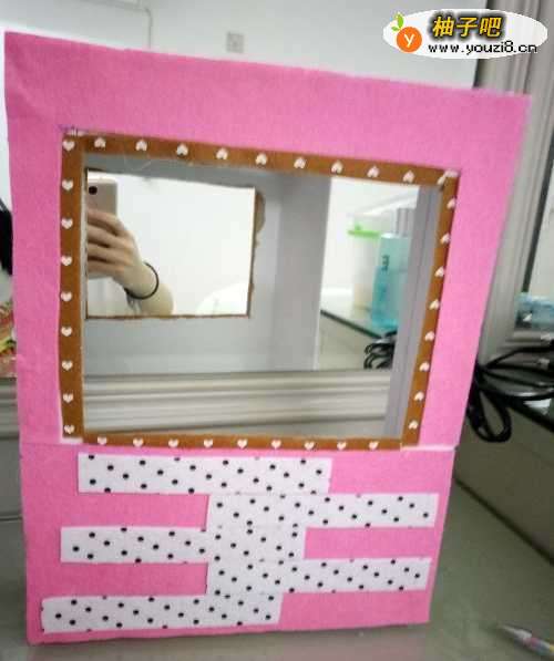 4第四步:将一些粉色的不织布剪成长方形,按照不规则的用胶枪把他们粘贴好。