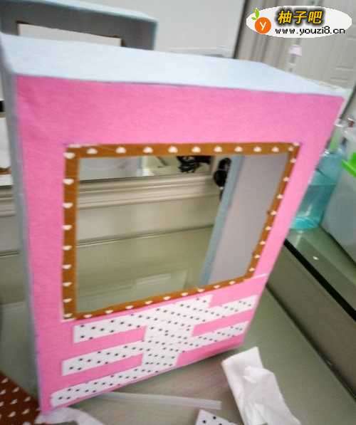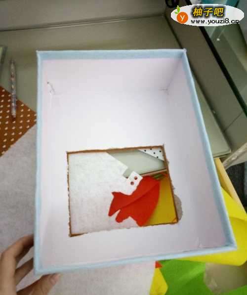 6第六步:小剧场反过来这一面还没有布置好。大家能根据自己的想法啊,将不同的布织布用的胶棒黏贴好。