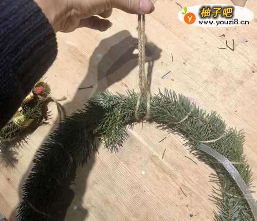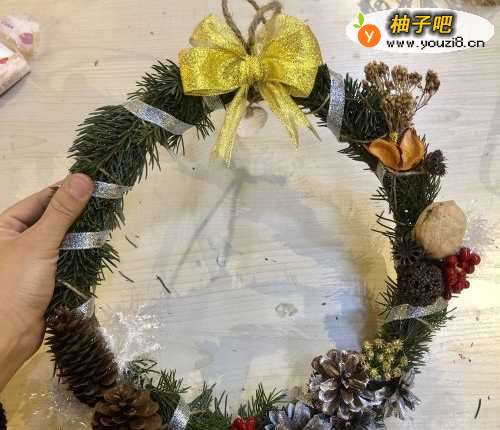 14系一个大蝴蝶结(我用的3.6厘米宽的)放在松圈顶上。