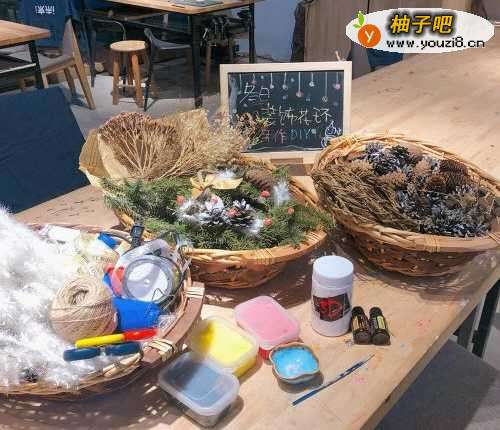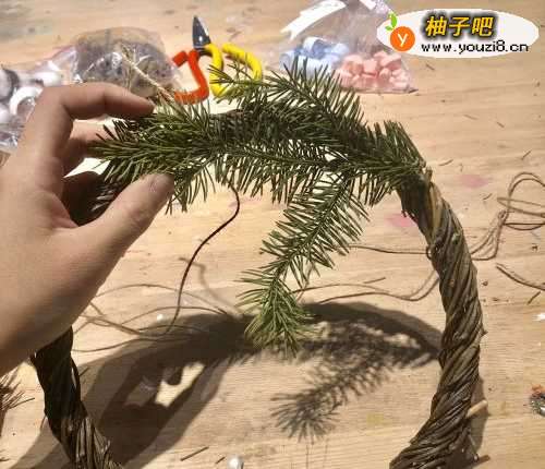 13找到自己喜欢的装饰物,在松圈上摆放搭配。