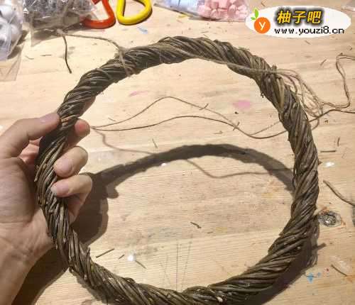 4首先是藤圈,我这个是自己做的藤圈,春天在江边散步,环卫工人修剪掉的柳枝,我搜集来,用盐水浸泡,增加韧度,围成的藤圈(大家也能网上购买藤圈,有现成的,南方也叫土茯苓圈)