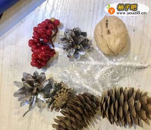 3但我们要用的是:藤条,缎带,麻绳,松果,胶枪,松针
