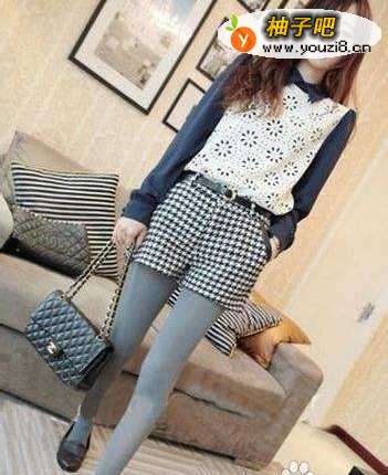 2带有复古风的衬衣,非常时尚的设计,再搭上一条经典格纹的高腰短裤,立即拉长了腿部的线条,使整个人看起高挑了很多,灰色的紧身打底裤也是具有瘦腿效果的。