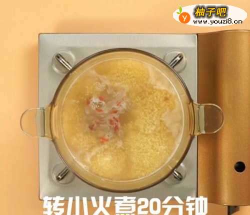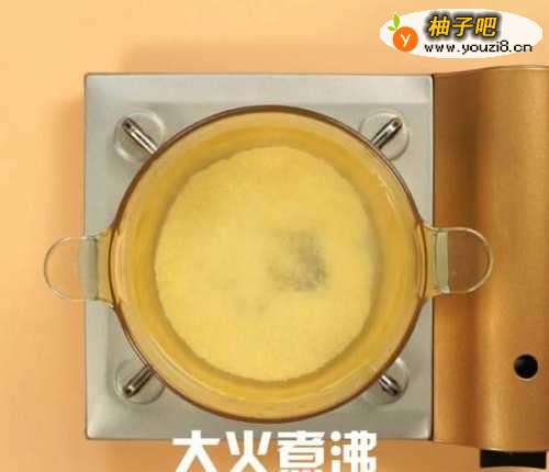 2然后加清水,倒入小米,大火煮沸。记得看锅哦,免得调皮的小米跳出来。