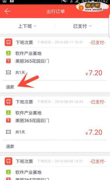 4在“出行订单”界面找到您想要退款的班次,点击其左下端的"退款”
