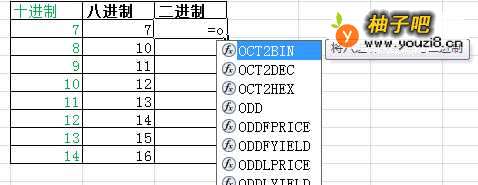 2在八进制下面的第一个单元格输入“=O”,在弹出列表中找到OCT2BIN函数,函数后面会有汉字报告,确保正确。双击它,使之填充到“=”后面。