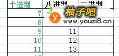 5点击二进制的111,光标放在单元格右下角变成+时,拖动它至所需要的单元格,即可批量复制该公式,最终显示八进制7~16的二进制转换结果111~11100,均对应十进制的7~14,如下图所示。