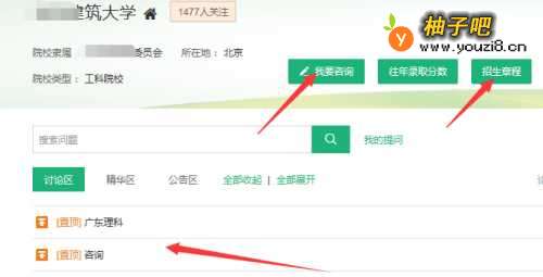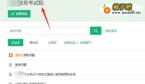 4然后,进入新页面,下拉,如下图,能看到咨询分两种,一种为对应省份招办,一种为具体到学校到咨询。同时上方有检索,可直接查找问题。