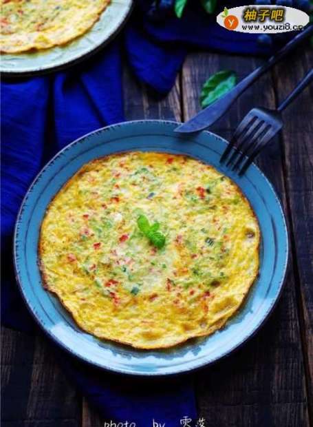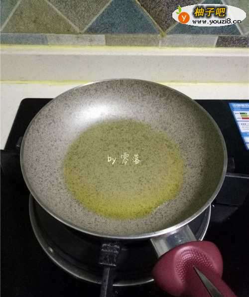 7平底锅里倒入适量橄榄油;倒入苦瓜蛋液,借助铲子将食材铺均匀;