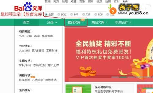 启用IE,进入百度首页,把鼠标移动到右上角【更多产品】,点击进入【文库】。