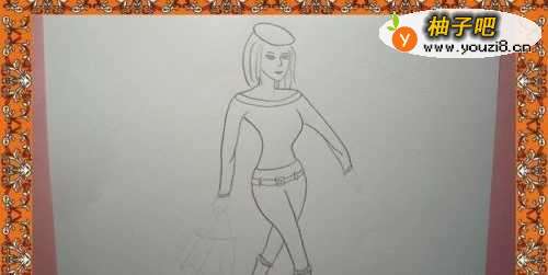 2接着,用黑色彩铅笔画女生的身体和腿脚出来,注意腿脚的高度与身体的比例关系,如下图所示。