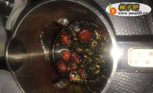 2豆浆机中加入10克黑芝麻,再加入适量去核红枣、核桃仁,适量红糖。