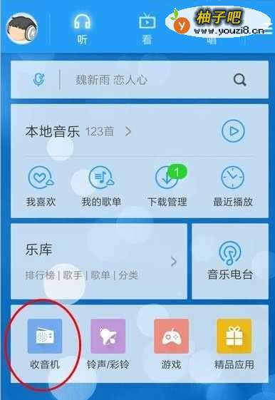 2进入到音乐默认的播放页面,我们能看到包含收音机,铃声彩铃,游戏,竞品应用模块,我们点击收音机栏目