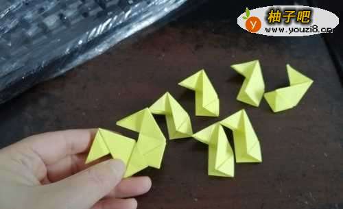 首先准备好八张正方形的彩纸,把彩纸的两角对折,如图。