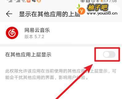 5点击后,将网易云音乐的悬浮窗权限开启,小编使用的是华为手机,需要开启在其他应用上方显示。